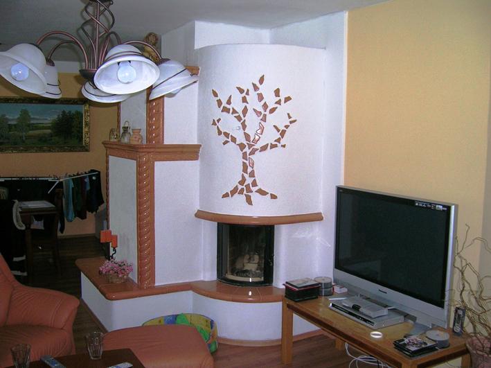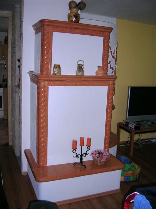 Akumulační krb pro vytápění jedné velké místnosti. Vestavěna je špičková krbová vložka švýcarského výrobce firmy Rüegg, model Merkur. Za vložkou je napojen litinošamotový výměník pro dosažení dlouhé akumulace, která je dále posílena obestavbou z akumulačních desek a tvarovek.