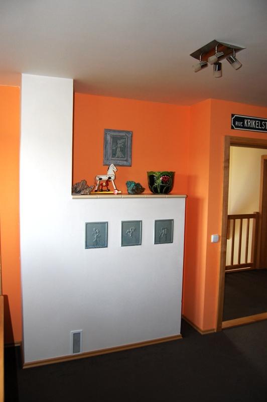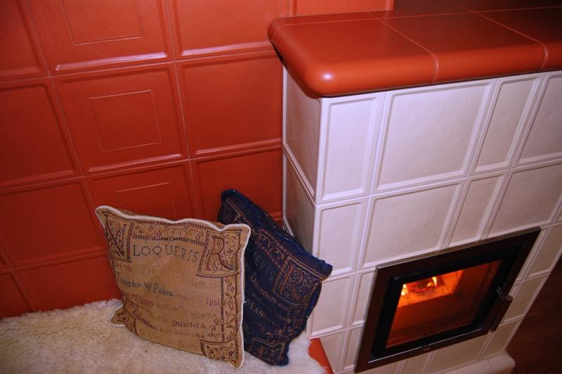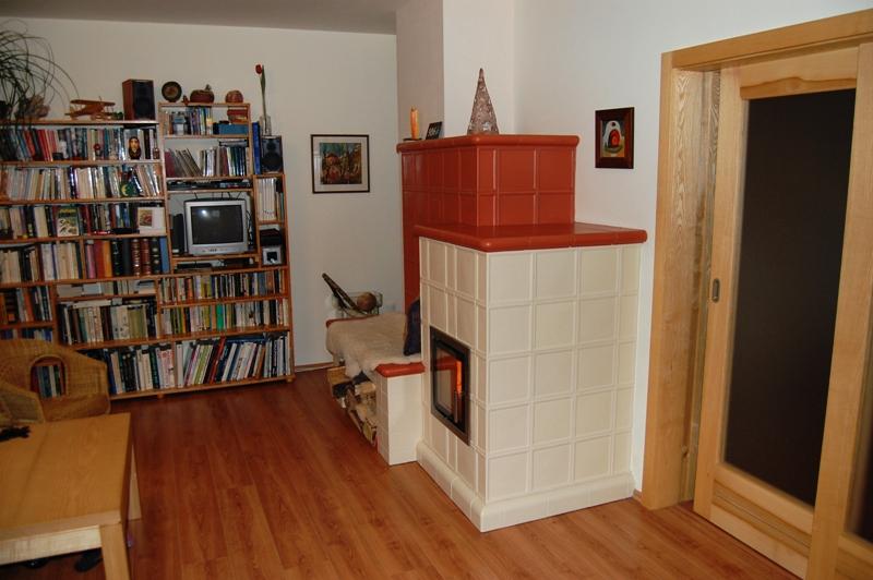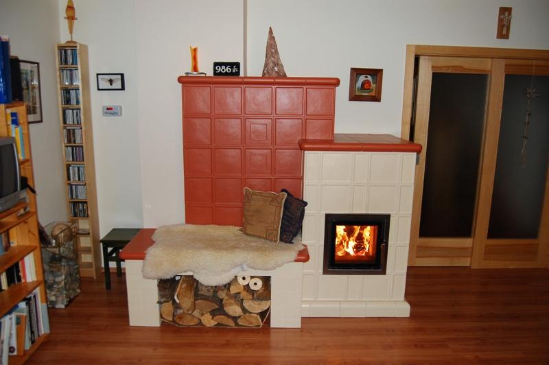 Modení kachlová kamna navržená do nízkoenergetického objektu, vytápějící obývací místnost, jídelnu s kuchyní , chodbu a schodiště v přízemí. Pomocí hypokaustního výměníku také pracovnu a koupelnu v prvním patře. Výkon topidla činí 4 kW /h s 12cti hodinovou akumulací . Topeniště kamen tvoří šamotové topeniště Brula v kombinaci se šamotovým tahovým systémen Brula. Přikládací dvířka firmy JOKR-nerez. Kamna jsou vybavena automatickou regulací Timpex Reg 200. Pro stavbu kamen byli použity keramické kachle firmy Hein s povrchovou glazuro Bílá matná v kombinaci s Tomato barvou.